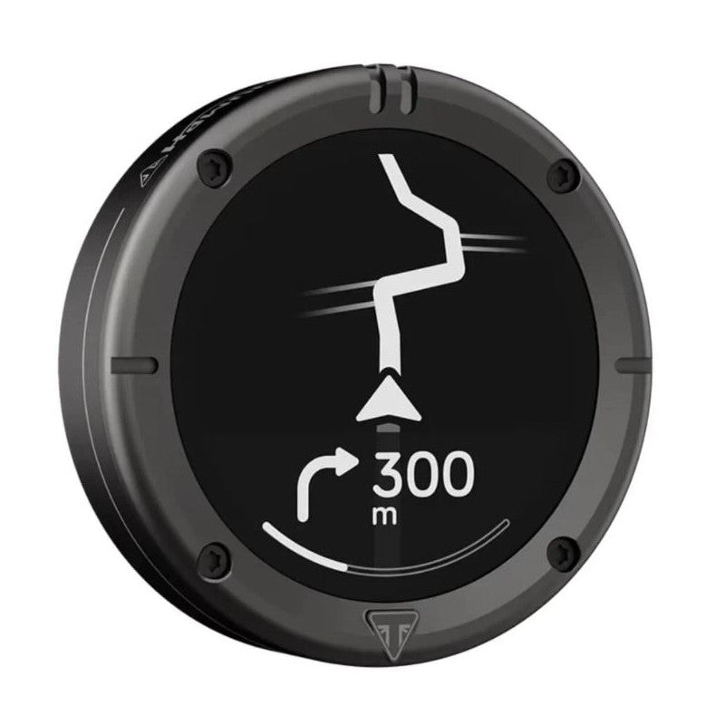 Dispositivo de navegación Beeline Moto II de Triumph con carcasa metálica resistente y pantalla más grande y luminosa que su predecesor. Se conecta con tu smartphone mediante una app para ofrecer navegación turn-by-turn (giro a giro), incluyendo datos como tiempo de llegada estimado y límites de velocidad. El equipo es resistente al agua y a los golpes (IP67), tiene una batería de larga duración de hasta 11 h y viene con soporte de manillar adaptable para diámetros de 22 mm y 25 mm. Incluye garantía de 2 años y actualizaciones de software gratuitas