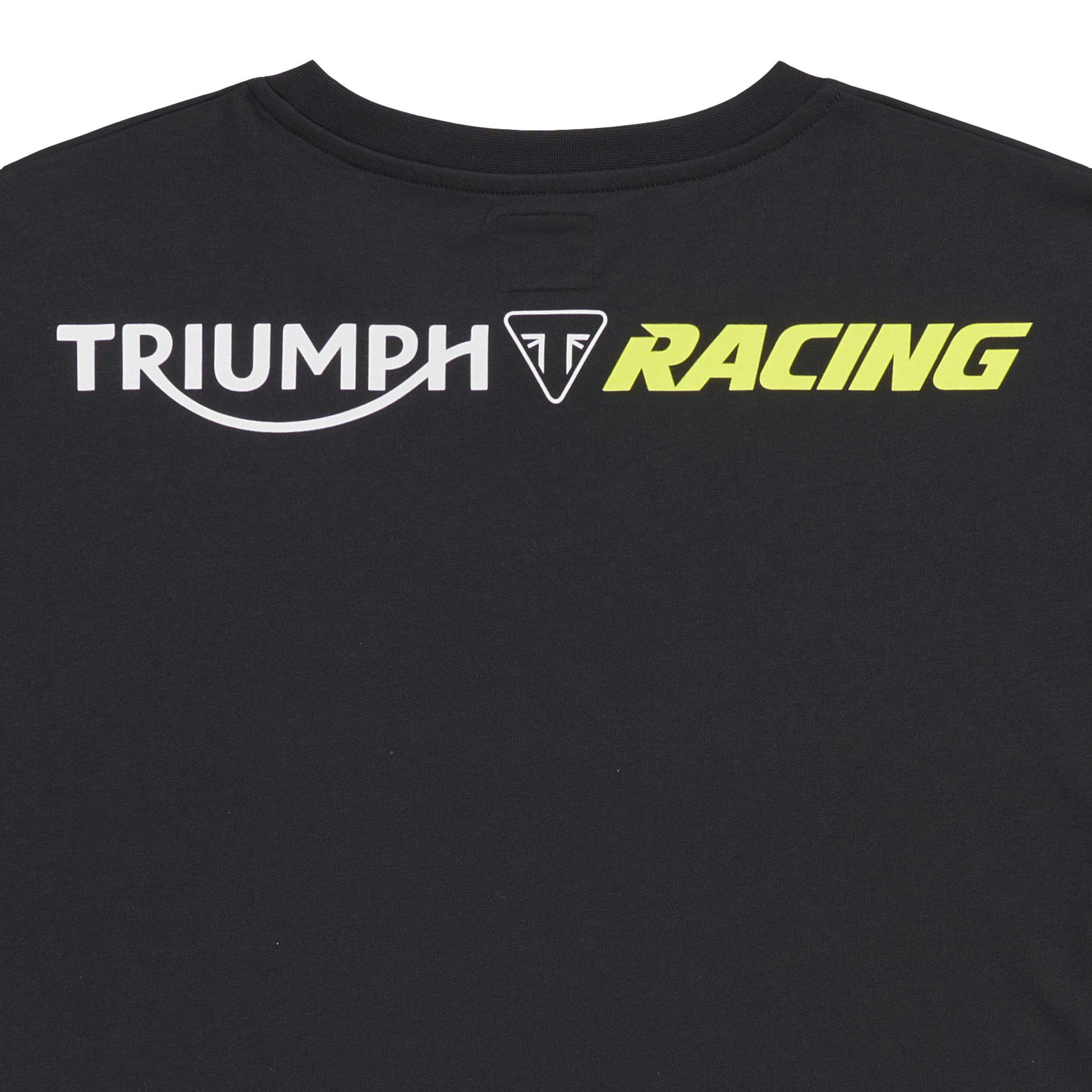Camiseta negra de Triumph con un pequeño logo en el pecho y un llamativo texto de Racing en color neón. Ideal para los entusiastas de las motocicletas, esta camiseta combina estilo y comodidad. Fabricada en 100% algodón, es perfecta para el uso diario o eventos casuales. Disponible en talla grande.